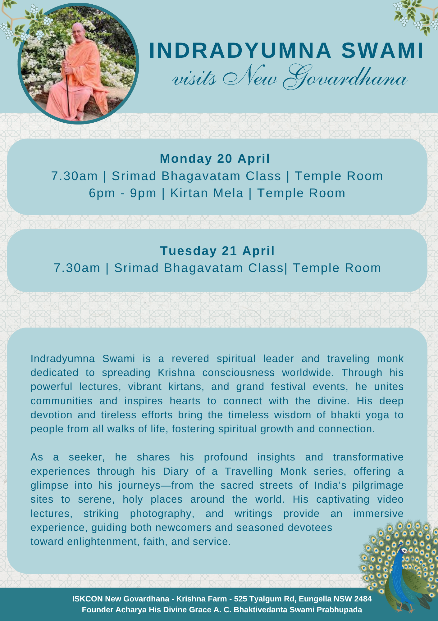 INDRADYUMNA SWAMI visits Monday 20 April 2026 7:30 am Tuesday 21 April 2026 8:30 am Google Calendar ICS