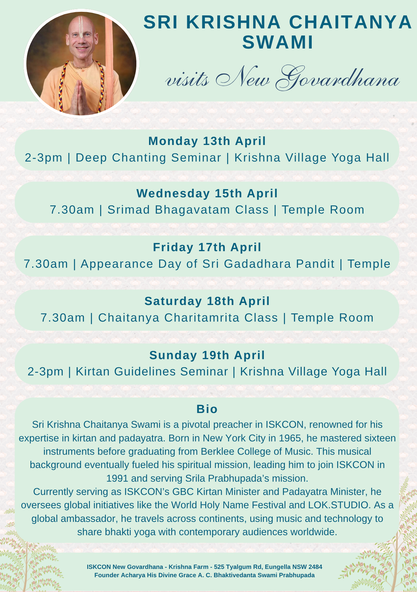 Back to All Events Sri Krishna Chaitanya Swami visits Monday 13 April 2026 2:00 pm Sunday 19 April 2026 3:00 pm Google Calendar ICS